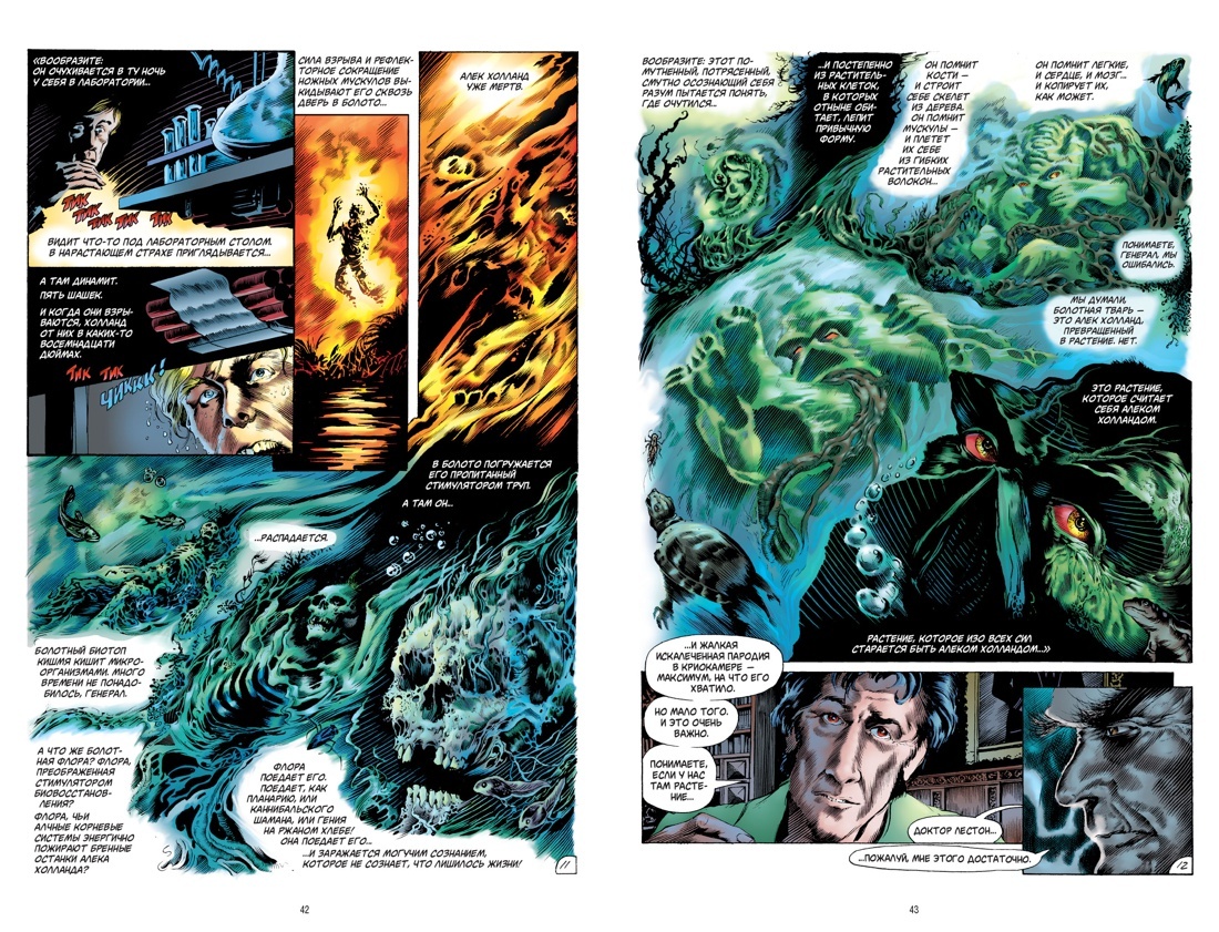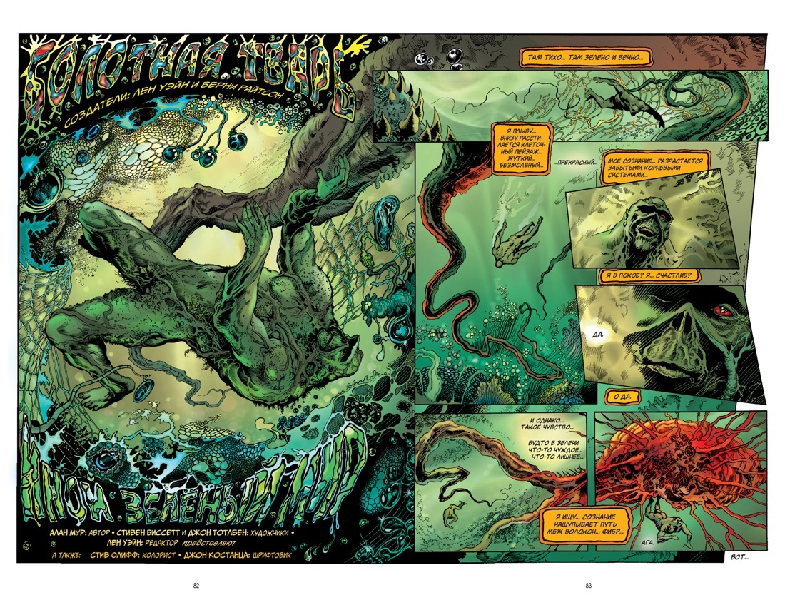 В 1983 году начинающий английский комиксист, чей революционный потенциал уже был очевиден, объединил усилия с тремя молодыми американскими художниками, чтобы вдохнуть новую жизнь в давно известного персонажа, опять вернувшегося в оборот благодаря фильму «Болотная Тварь» Уэса Крейвена. Творческий квартет Алана Мура, Стивена Р. Биссетта, Джона Тотлбена и Рика Витча радикально переосмыслил классическую биографию поднявшегося из трясины чудовища, испытав жанровые рамки на разрыв и создав одну из самых поразительных историй, какие только рассказывались средствами графического романа: от взрывающего мозг самопознания — к приключениям и откровениям космического масштаба.